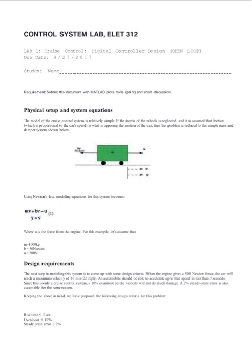Solved Control System Lab Elet 312 Lab 1 Cruise Control