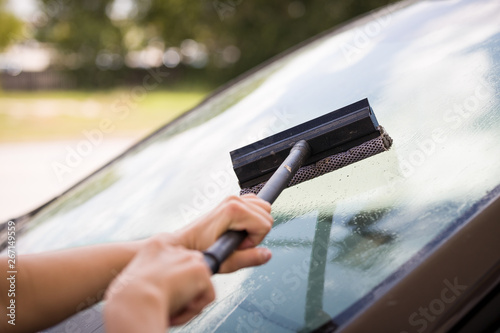 Washing Insects And Black Flies From A Car Windscreen Stock Photo