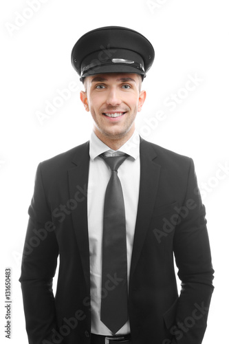 Young Chauffeur Standing On White Background Buy This Stock Photo
